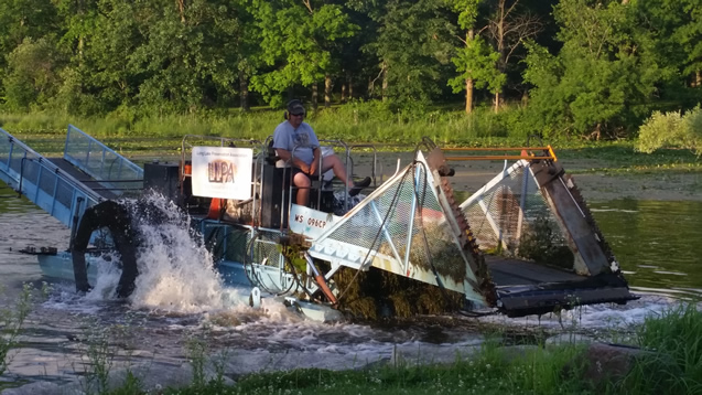 The Long Lake Preservation Association received a DNR permit to harvest 6.5 acres of weeds that entangle boat propellers and prevent swimming in several areas on Long Lake. The areas selected for harvesting were high traffic areas with an extensive weed problem near piers. The controlled collection of the weeds through harvesting will prevent the undesired cutting and fragmentation by propellers that would spread evasive weeds throughout the lake. The Association contracts with Midwest Aquatics to complete the work.